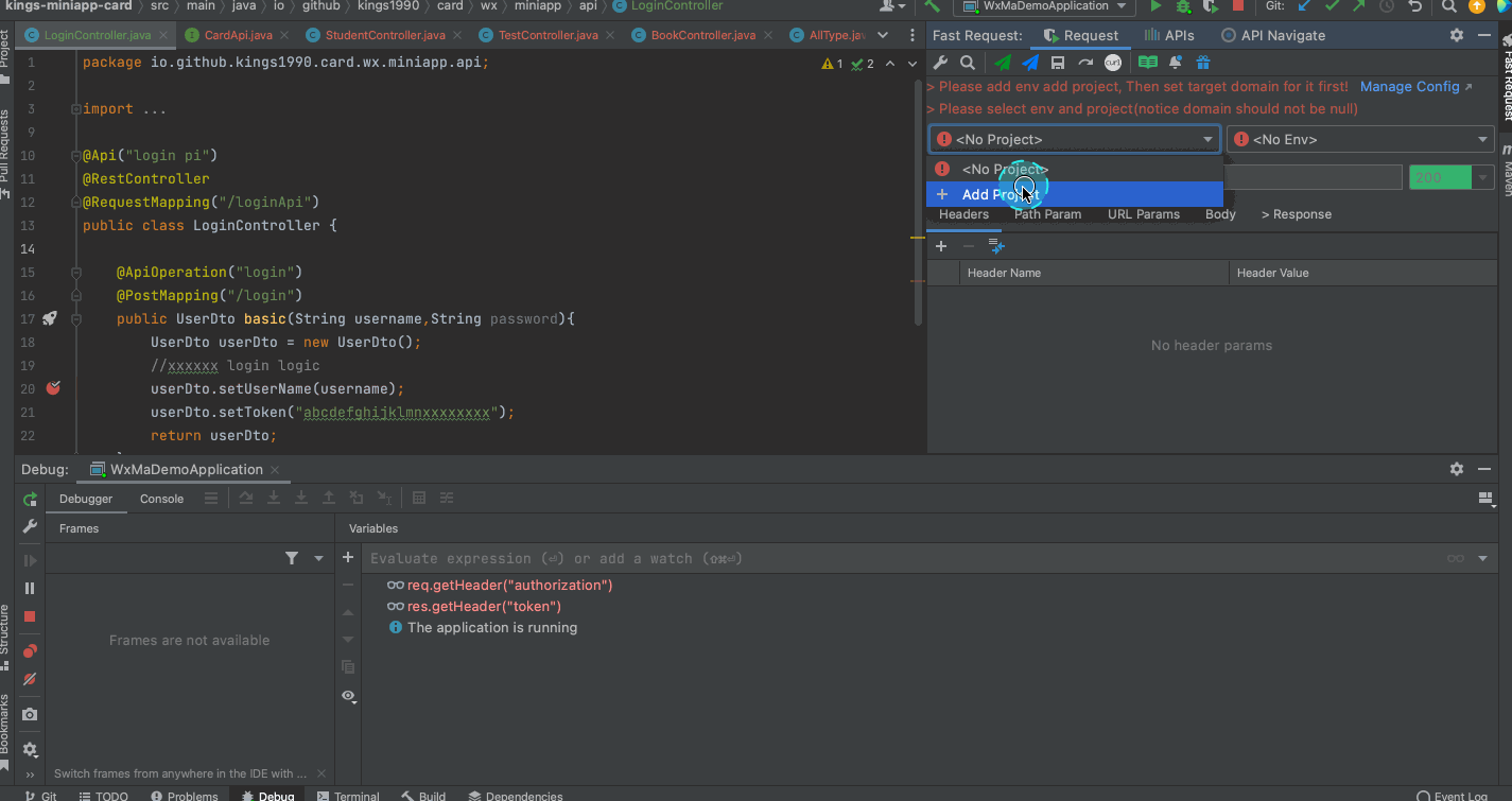 1. Click Manager config then add project name[example:wx card] and env[example:local、dev]