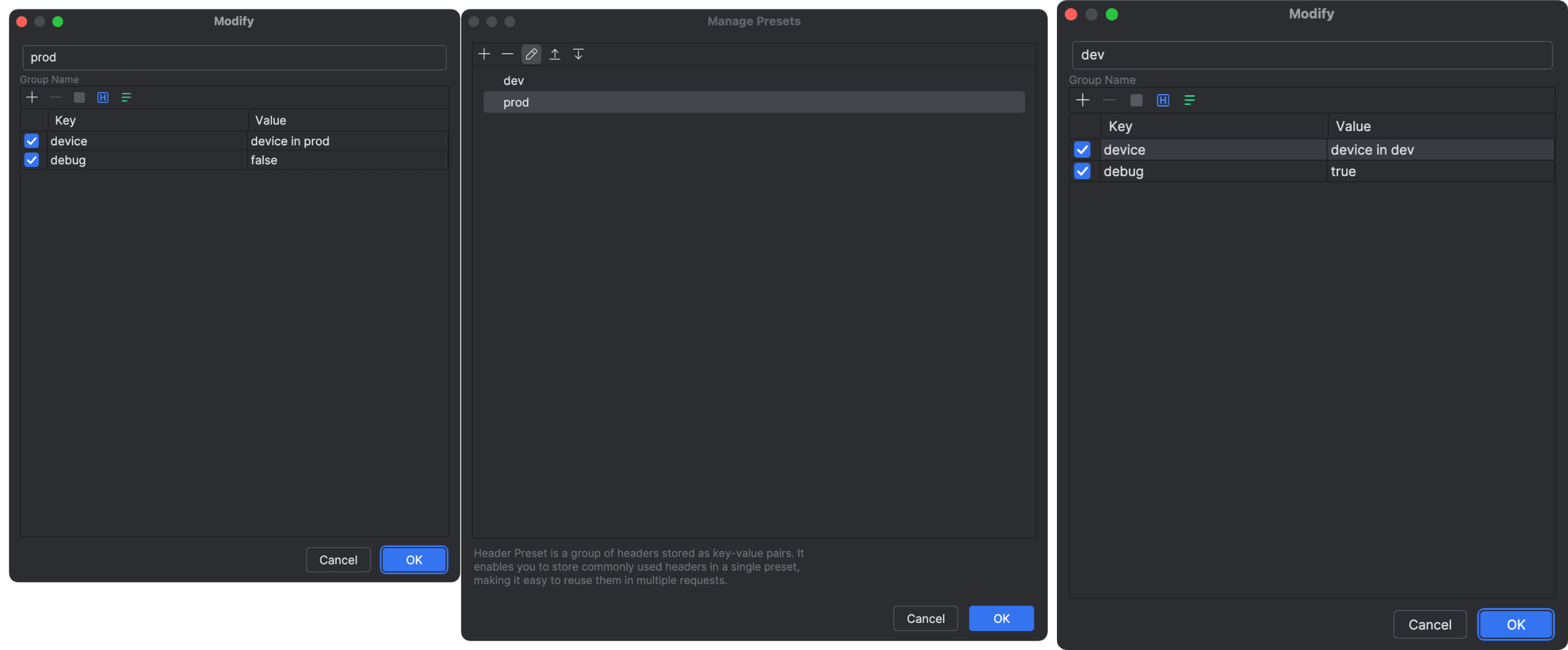Header presets allow you to create different header groups, manage header groups, and add all preset headers easily by selecting the dropping down item.