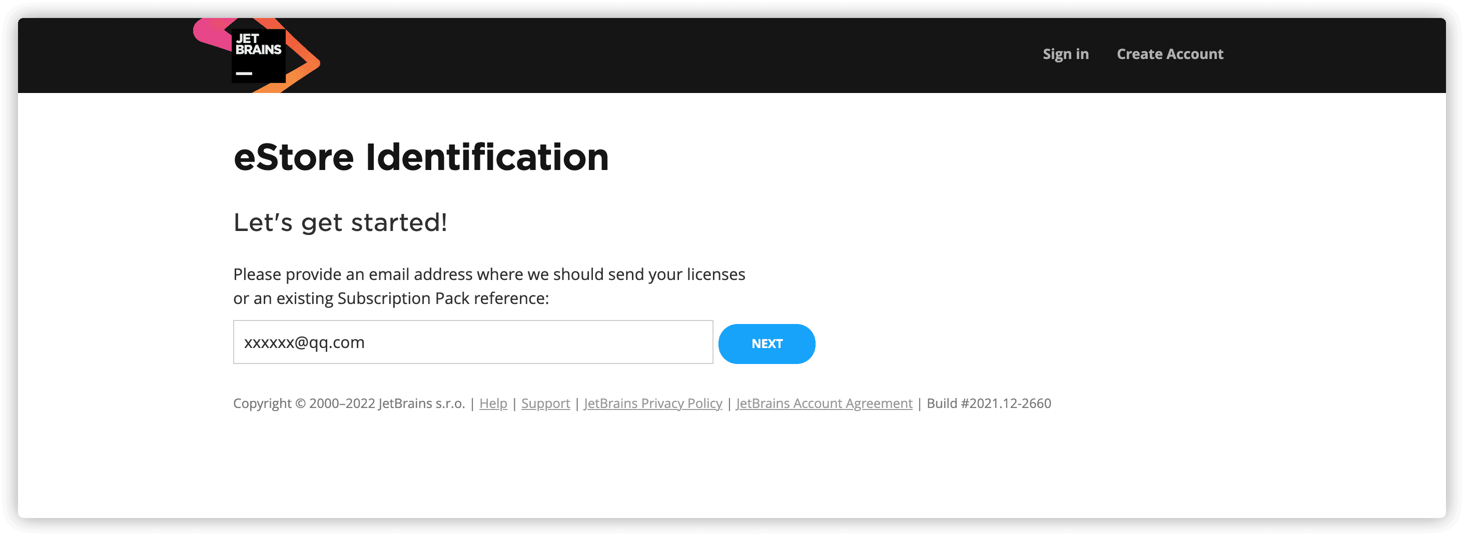 如果您没有注册 jetbrains 账号并登录,则会进入此页面,这边需要输入接受 license 的邮箱地址 点击 next 进入购买确认页面