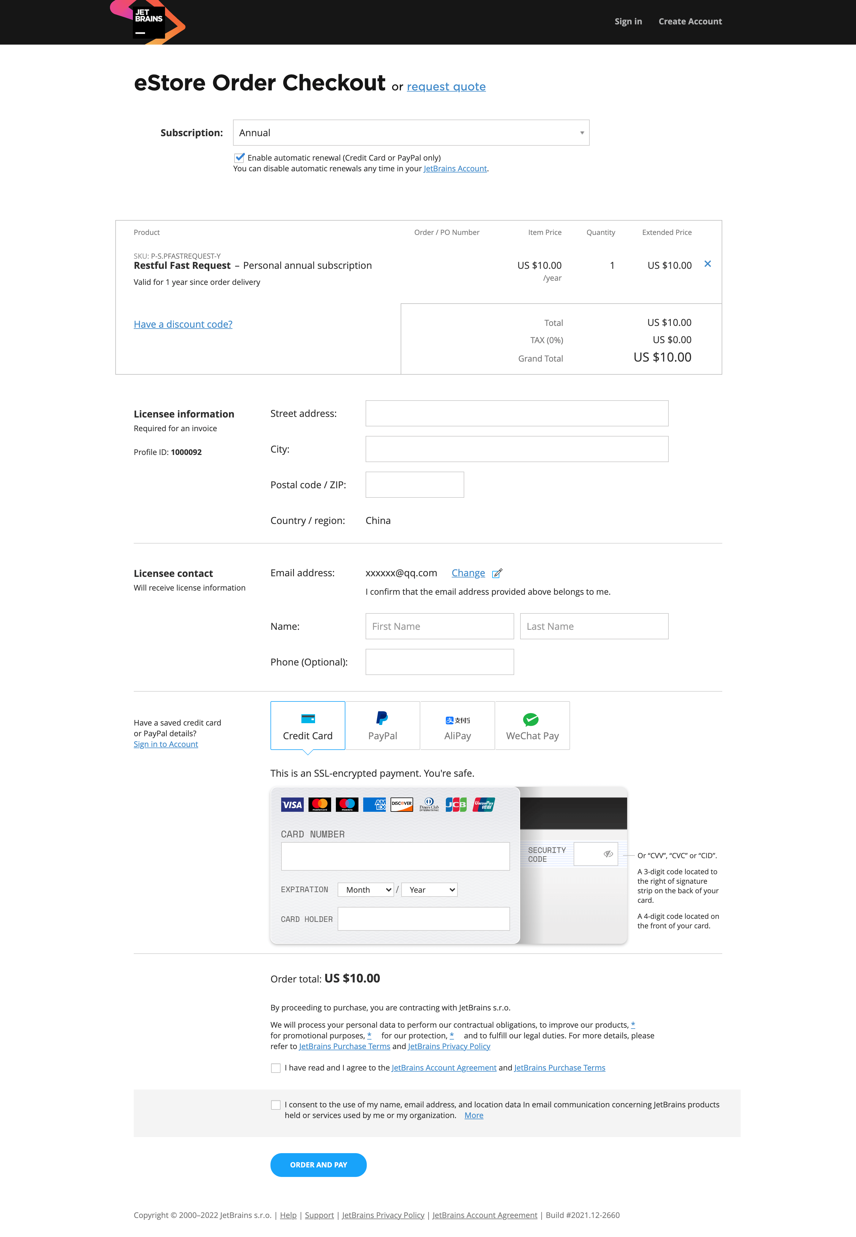 country/Region 修改为 China Mainland 中国大陆再返回点击购买即可 如果没有这个选项,可以换个账号用购买并使用离线激活来激活插件,或者邮件联系 Sales.cn@jetbrains.com 声明修改账号的 country/Region 成 China Mainland 中国大陆