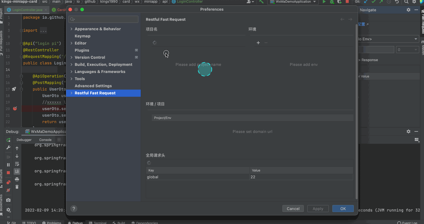 - 点击配置添加项目名 (如微信卡片) 和环境名 (如 local、dev)