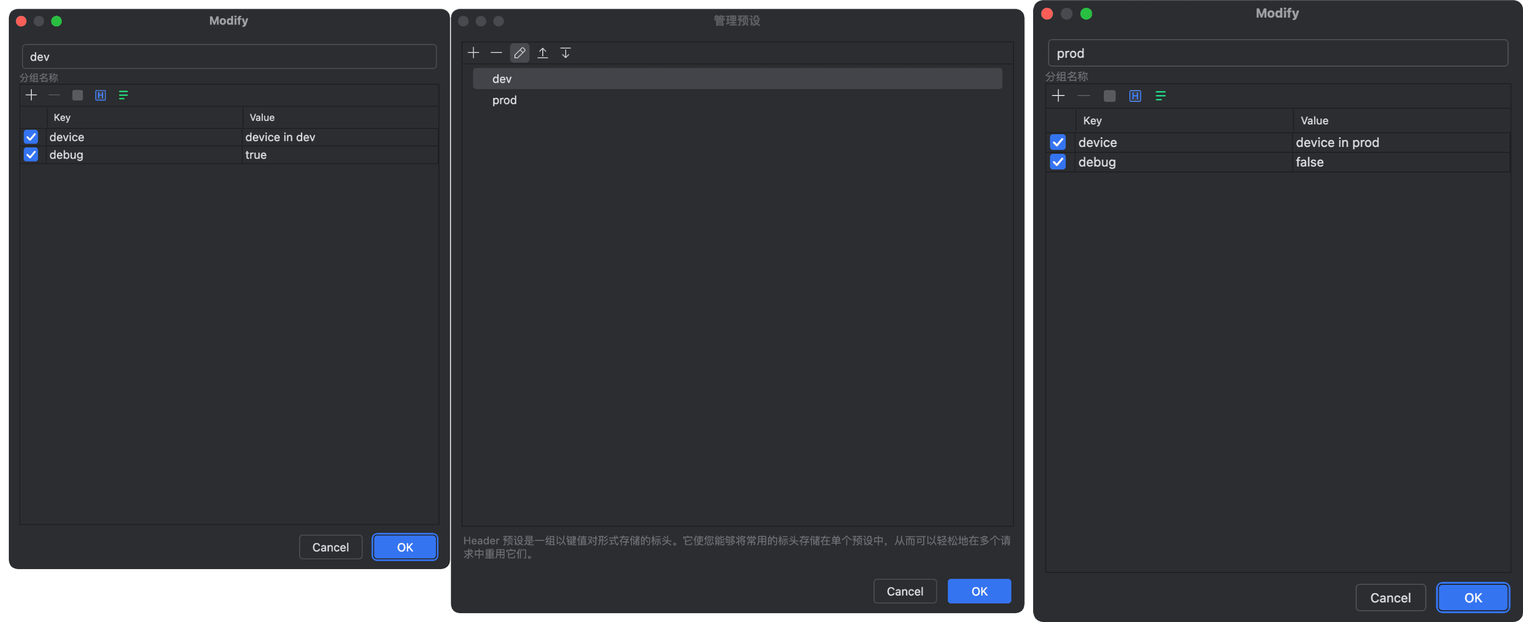 Header 预设支持创建不同的 Header 分组,管理各自的请求头,通过下拉选择轻松快捷得添加预设的 Header 参数。