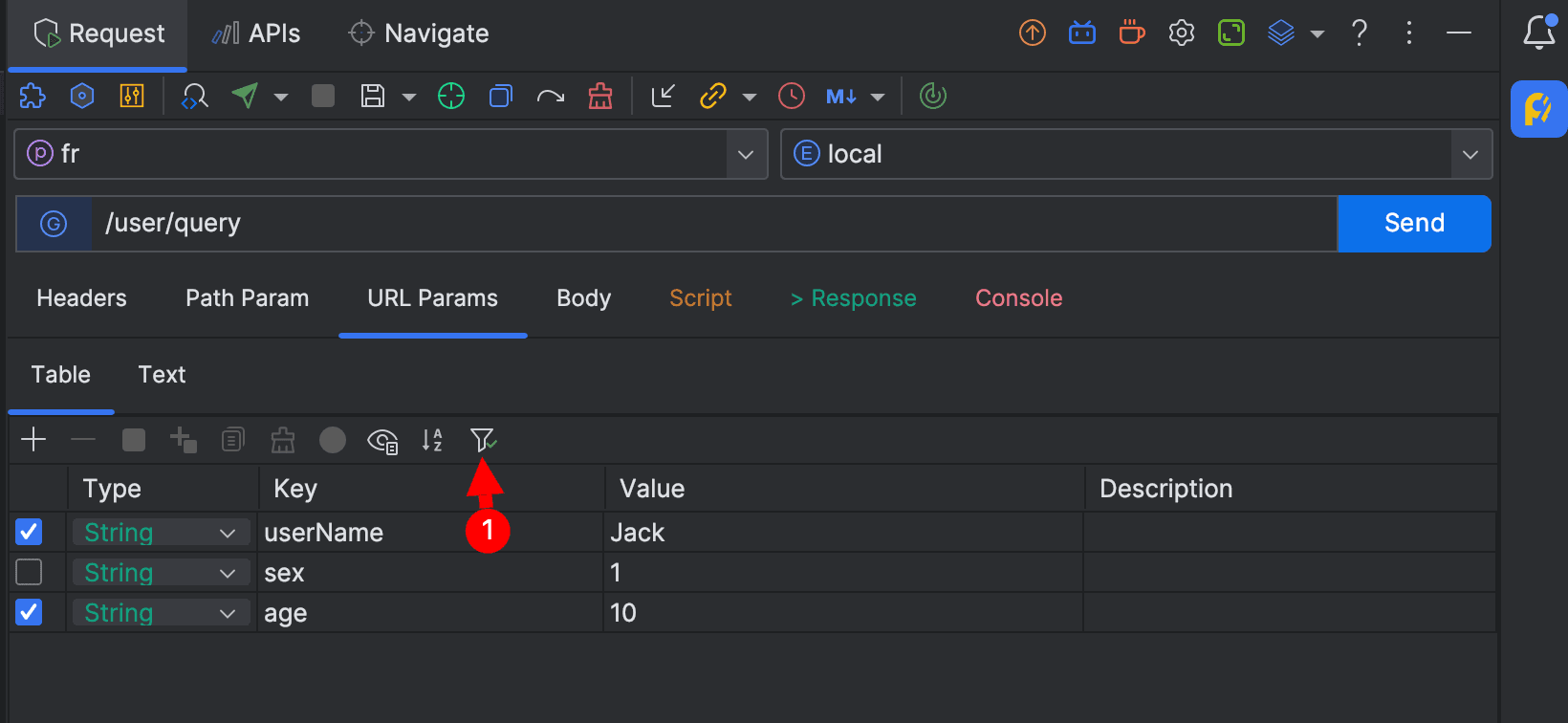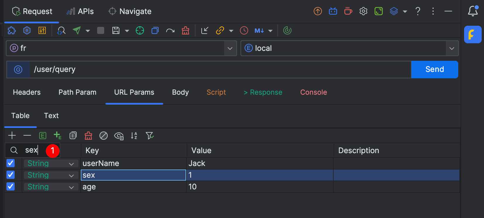 支持在列表中快速查找定位字段 key,输入关键字后再按方向键可以快速定位到对应的字段。此功能在 Headers 、Path Params、URL Params、Form URL-Encoded、Form-data 等 tab 中支持。